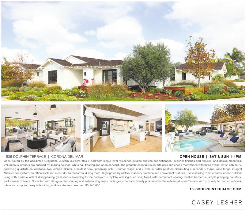 1536 DOLPHIN TERRACE | CORONA DEL MAR OPEN HOUSE | SAT & SUN 1-4PM Constructed by the acclaimed Graystone Custom Builders, this 4-bedroom single level residence exudes endless sophistication, superior finishes and fixtures, and deluxe amenities. Voluminous interiors are outlined by soaring ceilings, white oak flooring and open concept. The grand kitchen fulfills entertainers and chef’s motivations with three ovens, lavish cabinetry, sprawling quartzite countertops, two kitchen islands, breakfast nook, prepping sink, 8-burner range, and 2 walk-in butler pantries distributing a secondary fridge, wine fridge, integral Miele coffee system, an office nook and a corridor to the formal dining room. Highlighted by a black masonry fireplace and convenient built-ins, the vast living room creates indoor-outdoor living with a whole wall of disappearing glass doors sweeping to the backyard – replete with inground spa, firepit with permanent seating, built-in barbeque, ample prepping counters, and warmer drawers. Occupied with designer landscaping and entertaining areas the large corner lot is ideally positioned in the esteemed Irvine Terrace with proximity to renown schools, infamous shopping, exquisite dining and world-class beaches. $5,245,000 1536DOLPHINTERRACE.COM C A S E Y L E S H E R See also