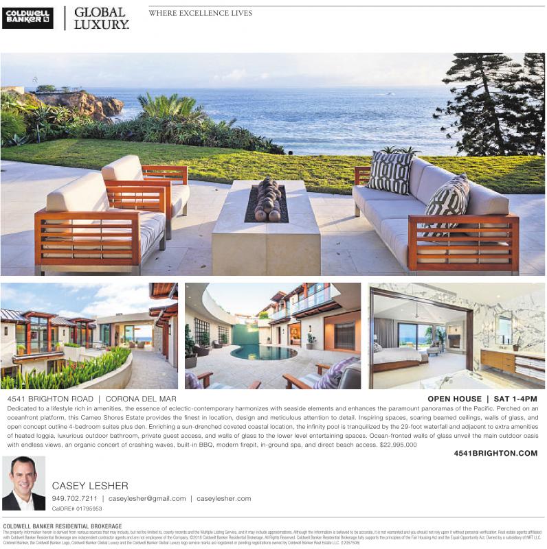 4541 BRIGHTON ROAD | CORONA DEL MAR OPEN HOUSE | SAT 1-4PM Dedicated to a lifestyle rich in amenities, the essence of eclectic-contemporary harmonizes with seaside elements and enhances the paramount panoramas of the Pacific. Perched on an