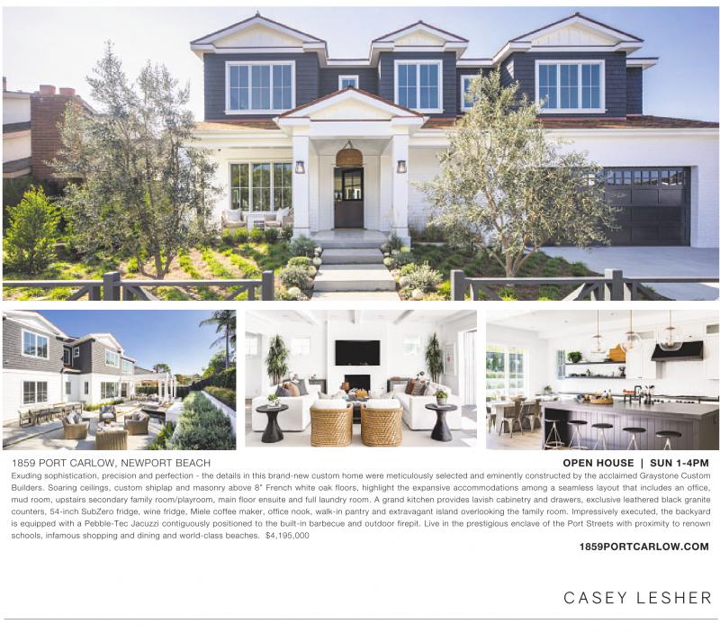 1859 PORT CARLOW, NEWPORT BEACH OPEN HOUSE | SUN 1-4PM Exuding sophistication, precision and perfection - the details in this brand-new custom home were meticulously selected and eminently constructed by the acclaimed Graystone Custom Builders. Soaring ceilings, custom shiplap and masonry above 8” French white oak floors, highlight the expansive accommodations among a seamless layout that includes an office, mud room, upstairs secondary family room/playroom, main floor ensuite and full laundry room. A grand kitchen provides lavish cabinetry and drawers, exclusive leathered black granite counters, 54-inch SubZero fridge, wine fridge, Miele coffee maker, office nook, walk-in pantry and extravagant island overlooking the family room. Impressively executed, the backyard is equipped with a Pebble-Tec Jacuzzi contiguously positioned to the built-in barbecue and outdoor firepit. Live in the prestigious enclave of the Port Streets with proximity to renown schools, infamous shopping and dining and world-class beaches. $4,195,000 1859PORTCARLOW.COM C A S E Y L E S H E R See also