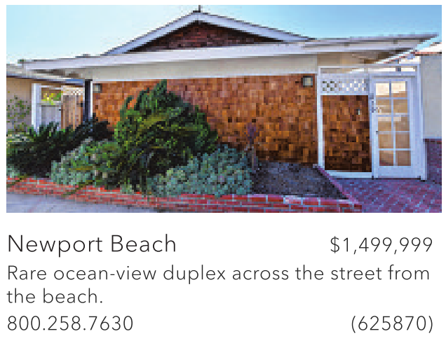 Newport Beach $1,499,999 Rare ocean-view duplex across the street from the beach.