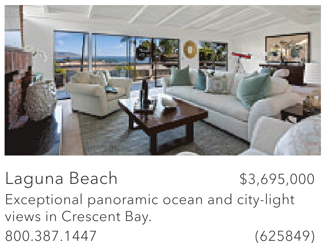 Laguna Beach $3,695,000 Exceptional panoramic ocean and city-light views in Crescent Bay.