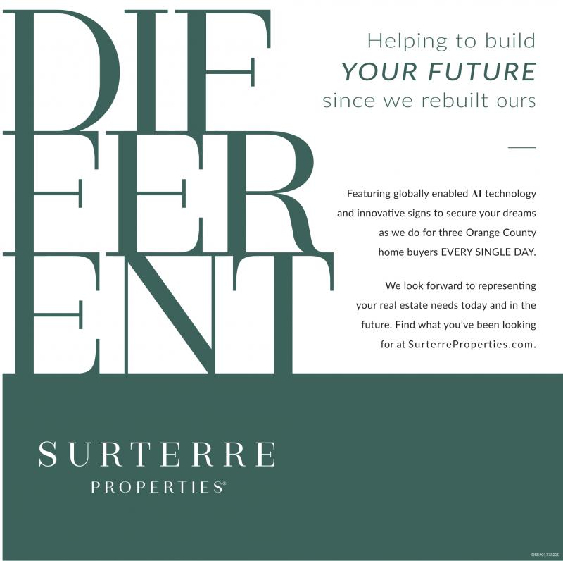 DIF Helping to build YO U R F U T U R E since we rebuilt ours FER Featuring globally enabled AI technology and innovative signs to secure your dreams as we do for three Orange County ENT home buyers EVERY SINGLE DAY. We look forward to representing your real estate needs today and in the future. Find what you’ve been looking for at SurterreProperties.com. DRE#01778230