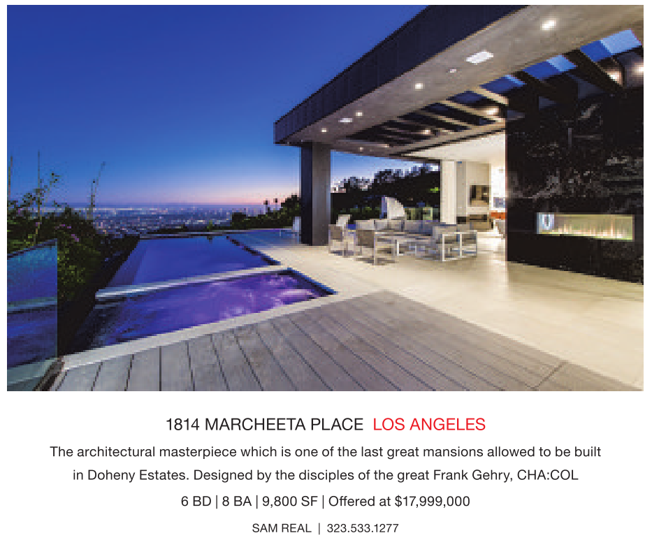 1814 MARCHEETA PLACE LOS ANGELES The architectural masterpiece which is one ofthe last great mansions allowed to be built in Doheny Estates. Designed by the disciples of the great Frank Gehry, CHA:COL 6BD|8BA |9,800 SF |Offered at $17,999,000 SAM REAL | 323.533.1277