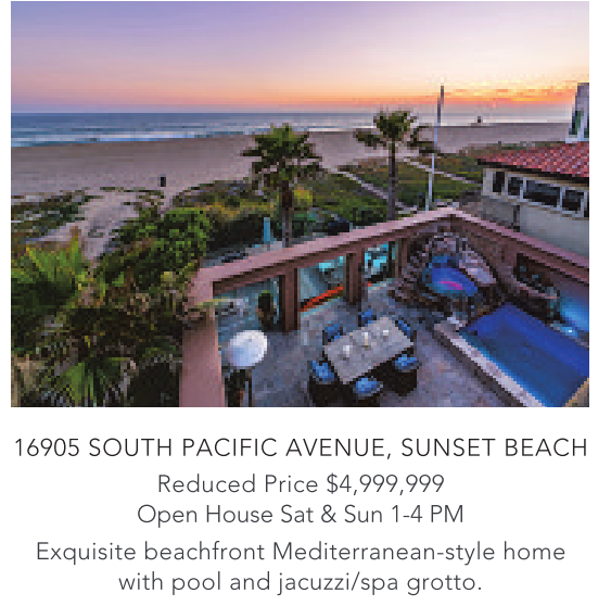 16905 SOUTH PACIFIC AVENUE, SUNSET BEACH Reduced Price $4,999,999 Open House Sat & Sun 1-4 PM Exquisite beachfront Mediterranean-style home with pool and jacuzzi/spa grotto.