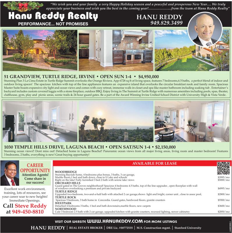 “We wish you and your family a very Happy Holiday season and a peaceful and prosperous New Year…. We truly appreciate your business and wish you the best in the coming year!………………...from the team at Hanu Reddy Realty”