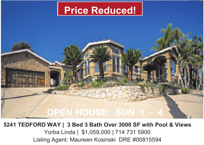 5241 TEDFORD WAY | 3Bed 3Bath Over 3000 SF with Pool &Views Yorba Linda | $1,059,000 |714 731 5900 Listing Agent: Maureen Kosinski DRE #00815594