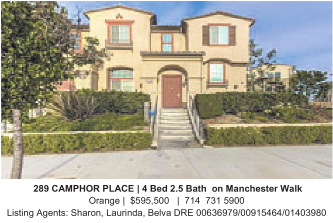 289 CAMPHOR PLACE |4Bed 2.5 Bath onManchester Walk Orange | $595,500 | 714 731 5900 Listing Agents: Sharon, Laurinda, Belva DRE 00636979/00915464/01403980