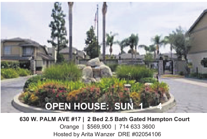 630 W. PALM AVE #17 | 2 Bed 2.5 Bath Gated Hampton Court Orange | $569,900 | 714 633 3600 Hosted by Arita Wanzer DRE #02054106