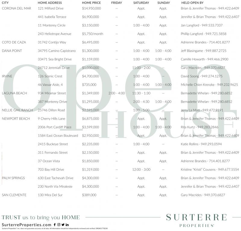 LAGUNA BEACH 934 Miramar Street $1,349,000 2:00 - 4:00 11:30 - 1:30 — Bernadette Whelan · 949.280.6852