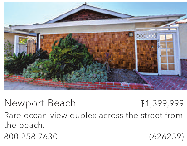 Newport Beach $1,399,999 Rare ocean-view duplex across the street from the beach.