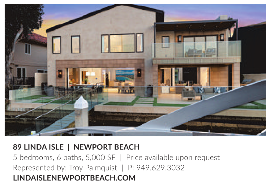 89 LINDA ISLE | NEWPORT BEACH 5 bedrooms, 6 baths, 5,000 SF | Price available upon request Represented by: Troy Palmquist | P: 949.629.3032 LINDAISLENEWPORTBEACH.COM