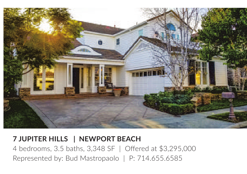7 JUPITER HILLS | NEWPORT BEACH 4 bedrooms, 3.5 baths, 3,348 SF | Offered at $3,295,000 Represented by: Bud Mastropaolo | P: 714.655.6585