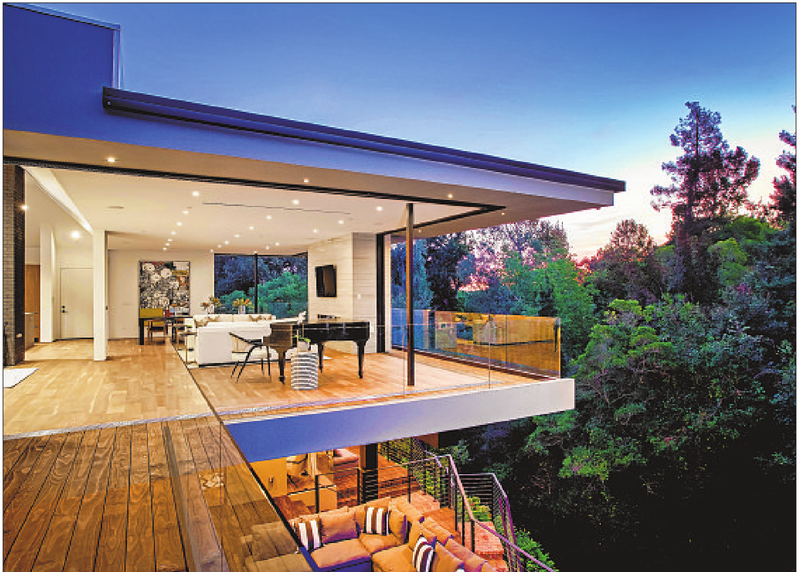 Walls of floor-to-ceiling windows frame the living room, bringing leafy views inside. Expanded decking creates additional space outdoors and sits flush with a new cantilevered swimming pool, which gives the illusion of floating over the hillside.