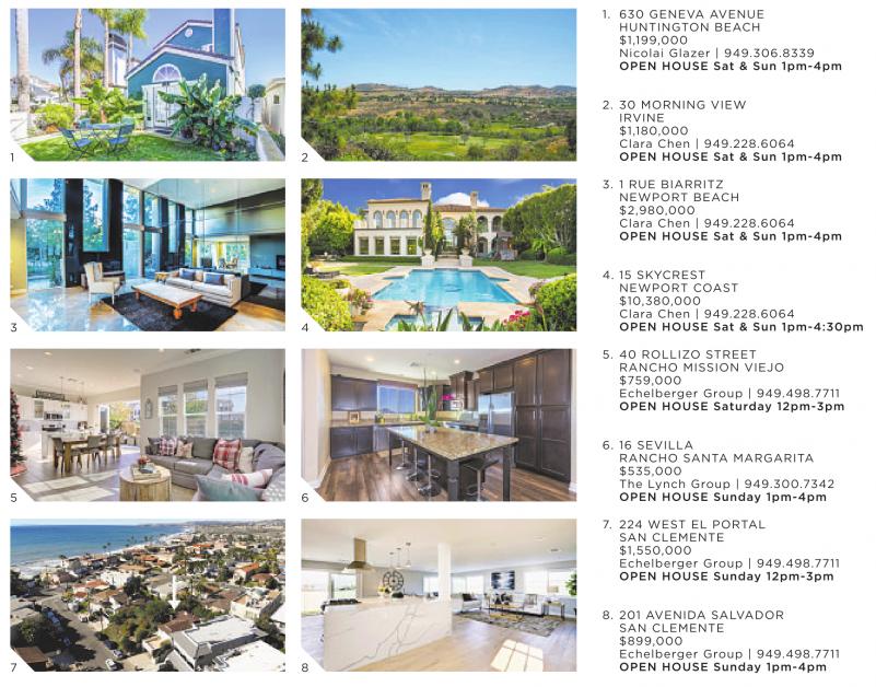 1. 630 GENEVA AVENUE HUNTINGTON BEACH $1,199,000 Nicolai Glazer | 949.306.8339 OPEN HOUSE Sat & Sun 1pm-4pm 1 2 2. 30 MORNING VIEW IRVINE $1,180,000 Clara Chen | 949.228.6064 OPEN HOUSE Sat & Sun 1pm-4pm 3 5 7 4 6 8 3. 1 RUE BIARRITZ NEWPORT BEACH $2,980,000 Clara Chen | 949.228.6064 OPEN HOUSE Sat & Sun 1pm-4pm 4. 15 SKYCREST NEWPORT COAST $10,380,000 Clara Chen | 949.228.6064 OPEN HOUSE Sat & Sun 1pm-4:30pm 5. 40 ROLLIZO STREET RANCHO MISSION VIEJO $759,000 Echelberger Group | 949.498.7711 OPEN HOUSE Saturday 12pm-3pm 6. 16 SEVILLA RANCHO SANTA MARGARITA $535,000 The Lynch Group | 949.300.7342 OPEN HOUSE Sunday 1pm-4pm 7. 224 WEST EL PORTAL SAN CLEMENTE $1,550,000 Echelberger Group | 949.498.7711 OPEN HOUSE Sunday 12pm-3pm 8. 201 AVENIDA SALVADOR SAN CLEMENTE $899,000 Echelberger Group | 949.498.7711 OPEN HOUSE Sunday 1pm-4pm