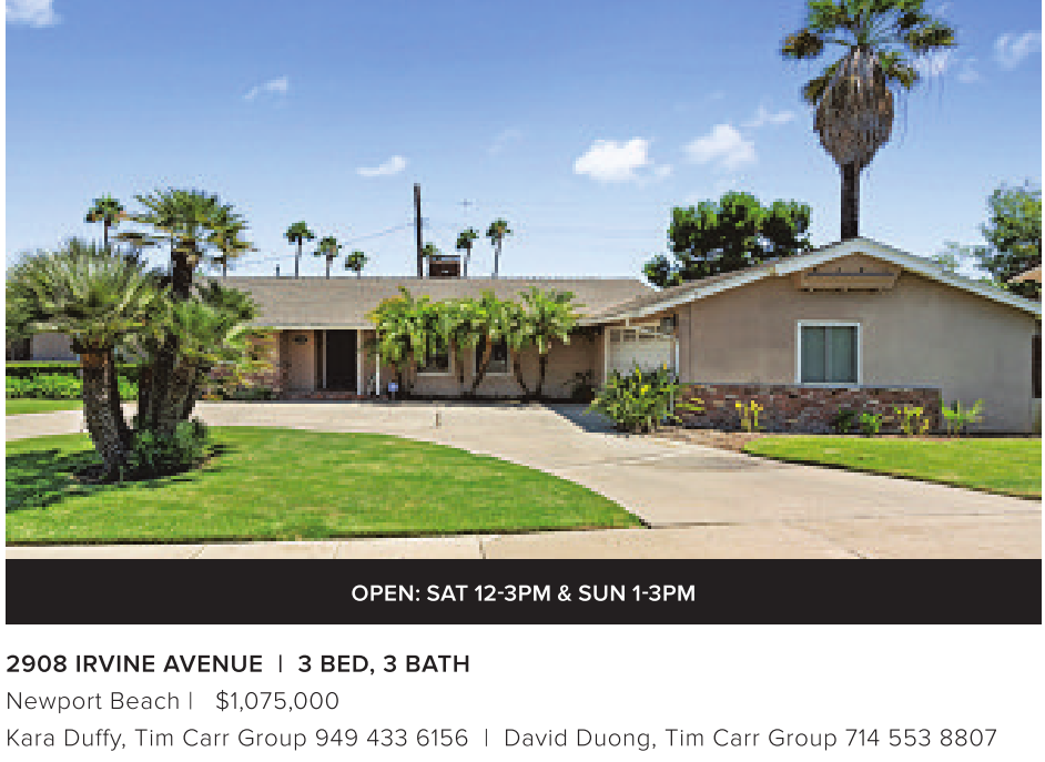 2908 IRVINE AVENUE | 3 BED, 3 BATH Newport Beach | $1,075,000 Kara Duffy, Tim Carr Group 949 433 6156 | David Duong, Tim Carr Group 714 553 8807