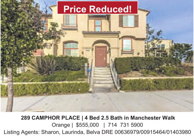 289 CAMPHOR PLACE |4Bed 2.5 Bath inManchester Walk Orange | $555,000 | 714 731 5900 Listing Agents: Sharon, Laurinda, Belva DRE 00636979/00915464/01403980
