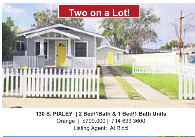 130 S. PIXLEY | 2Bed/1Bath &1Bed/1 Bath Units Orange | $799,000 | 714 633 3600 Listing Agent: AlRicci