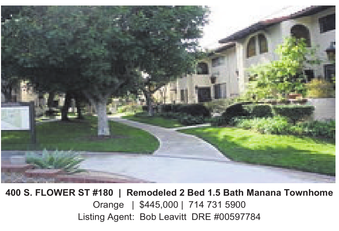 400 S. FLOWER ST#180 | Remodeled 2Bed 1.5 Bath Manana Townhome Orange | $445,000 | 714 731 5900 Listing Agent: Bob Leavitt DRE #00597784