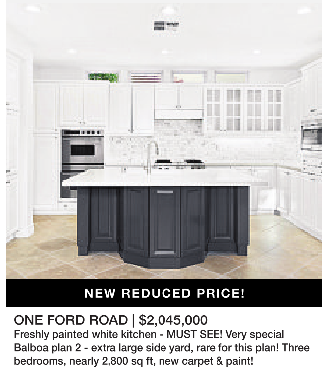 ONE FORD ROAD | $2,045,000 Freshly painted white kitchen - MUST SEE! Very special Balboa plan 2 - extra large side yard, rare for this plan! Three bedrooms, nearly 2,800 sq ft, new carpet & paint!