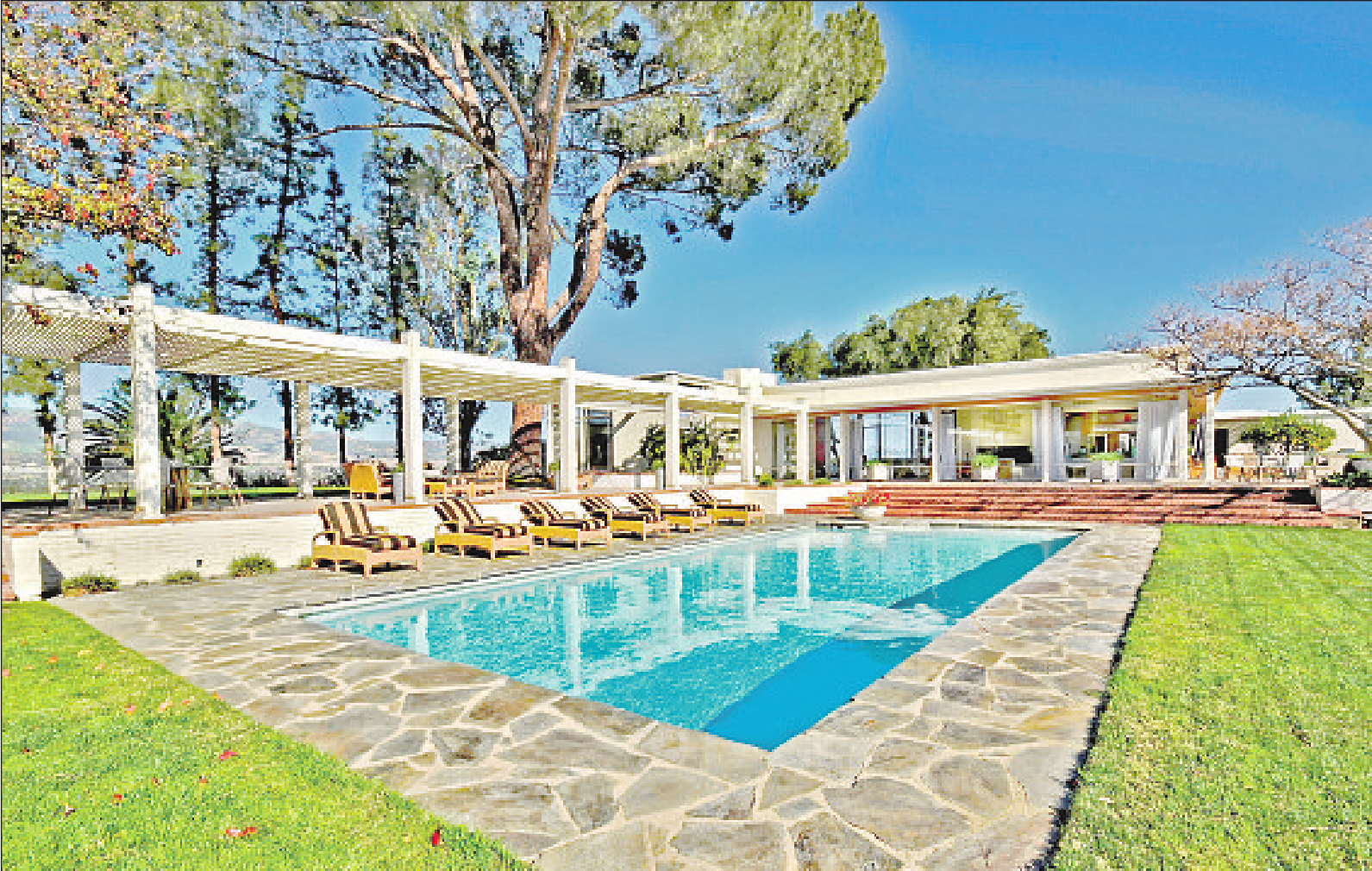 six bathrooms. Two swimming pools, amotor court, a guesthouse, lawn and