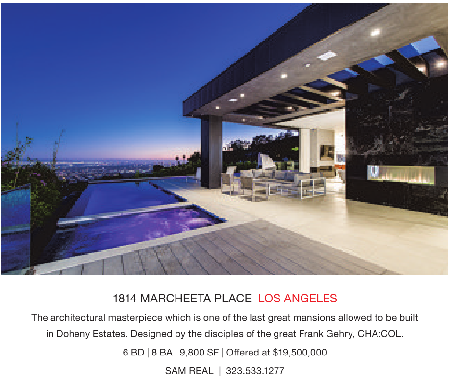 1814 MARCHEETA PLACE LOS ANGELES The architectural masterpiece which is one ofthe last great mansions allowed tobebuilt in Doheny Estates. Designed by the disciples ofthe great Frank Gehry, CHA:COL. 6BD|8BA|9,800 SF |Offered at $19,500,000 SAM REAL | 323.533.1277