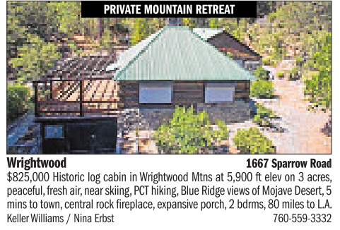 PRIVATE MOUNTAIN RETREAT Wrightwood 1667 SparrowRoad $825,000 Historic log cabin in Wrightwood Mtns at 5,900 ft elevon3acres, peaceful,freshair,near skiing,PCT hiking,Blue Ridge views of Mojave Desert,5 mins to town, central rock fireplace, expansive porch, 2bdrms, 80 miles to L.A. KellerWilliams /Nina Erbst 760-559-3332