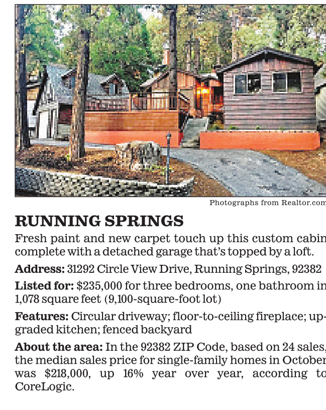 Photographs from Realtor.com RUNNING SPRINGS Fresh paint and new carpet touch up this custom cabin complete with a detached garage that’s topped by a loft. Address: 31292 Circle View Drive, Running Springs, 92382 Listed for: $235,000 for three bedrooms, one bathroom in 1,078 square feet (9,100-square-foot lot) Features: Circular driveway; floor-to-ceiling fireplace; upgraded kitchen; fenced backyard About the area: In the 92382 ZIP Code, based on 24 sales, the median sales price for single-family homes in October was $218,000, up 16% year over year, according to CoreLogic.