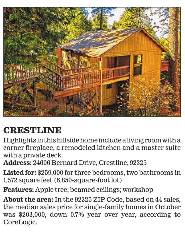 CRESTLINE Highlights in this hillside home include a living room with a corner fireplace, a remodeled kitchen and a master suite with a private deck. Address: 24606 Bernard Drive, Crestline, 92325 Listed for: $259,000 for three bedrooms, two bathrooms in 1,572 square feet (6,850-square-foot lot) Features: Apple tree; beamed ceilings; workshop About the area: In the 92325 ZIP Code, based on 44 sales, the median sales price for single-family homes in October was $203,000, down 0.7% year over year, according to CoreLogic. See also