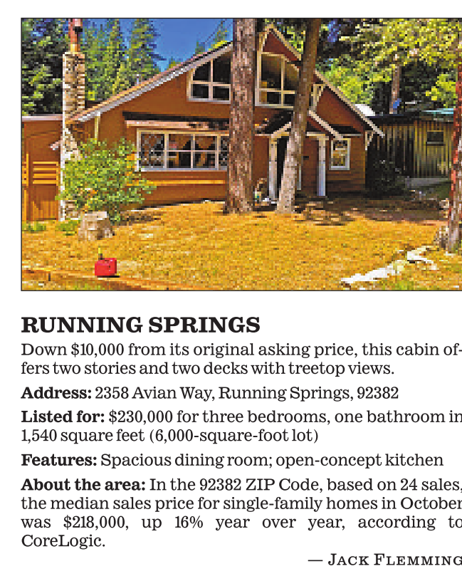 RUNNING SPRINGS Down $10,000 from its original asking price, this cabin offers two stories and two decks with treetop views. Address: 2358 Avian Way, Running Springs, 92382 Listed for: $230,000 for three bedrooms, one bathroom in 1,540 square feet (6,000-square-foot lot) Features: Spacious dining room; open-concept kitchen About the area: In the 92382 ZIP Code, based on 24 sales, the median sales price for single-family homes in October was $218,000, up 16% year over year, according to CoreLogic. — Jack Flemming