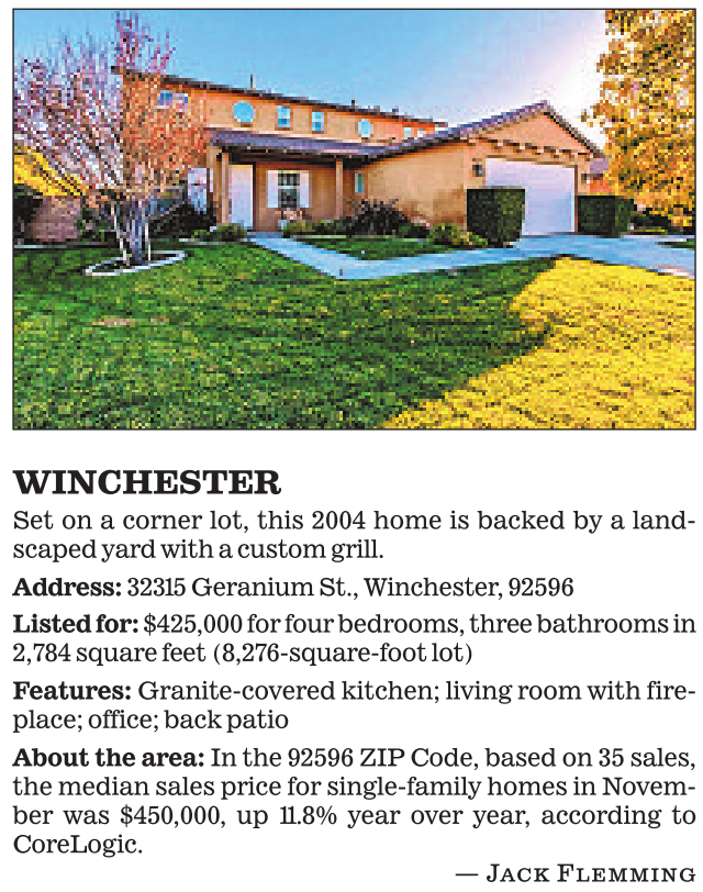 WINCHESTER Set on a corner lot, this 2004 home is backed by a landscaped yard with a custom grill. Address: 32315 Geranium St., Winchester, 92596 Listed for: $425,000 for four bedrooms, three bathrooms in 2,784 square feet (8,276-square-foot lot) Features: Granite-covered kitchen; living room with fireplace; office; back patio About the area: In the 92596 ZIP Code, based on 35 sales, the median sales price for single-family homes in November was $450,000, up 11.8% year over year, according to CoreLogic. — Jack Flemming