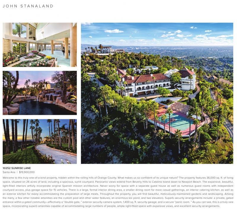 J O H N S T A N A L A N D 10252 SUNRISE LANE Santa Ana | $19,900,000 Welcome to this truly one-of-a-kind property, hidden within the rolling hills of Orange County. What makes us so confident of its unique nature? The property features 36,000 sq. ft. of living space, situated on 26 acres of land, including a spacious, sunlit courtyard. Panoramic views extend from Beverly Hills to Catalina Island down to Newport Beach. The expansive, beautiful, light-filled interiors artfully incorporate original Spanish mission architecture. Never worry for space with a separate guest house as well as numerous guest rooms with independent courtyard access, plus garage space for 15 vehicles. There is a large, formal interior dining area, a smaller dining room for more casual gatherings, an interior catering kitchen, as well as an exterior kitchen for easily accommodating the preparation of large meals. Throughout the property, you will find beautiful, meticulously-maintained gardens and landscaping. Among the many, a few other notable amenities are the custom pool and other water features, an enormous koi pond, and two elevators. Superb security arrangements include: a private, gated entrance within a gated community—effectively a “double gate, ” exterior security camera system, 1,400 sq. ft. security garage, and a secure “panic room. ” As you can see, this is a truly rare space, incorporating superb amenities capable of accommodating large numbers of people, ample light-filled space with expansive views, and excellent security arrangements.