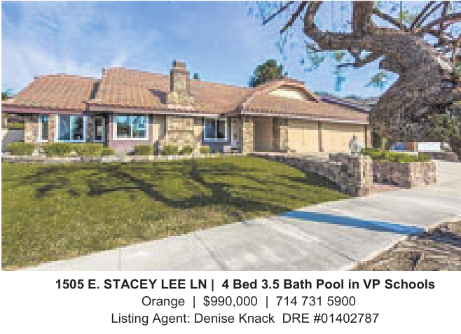 1505 E.STACEY LEE LN | 4 Bed 3.5 Bath Pool inVP Schools Orange | $990,000 | 714 731 5900 Listing Agent: Denise Knack DRE #01402787