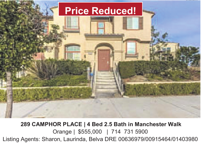 289 CAMPHOR PLACE |4Bed 2.5 Bath inManchester Walk Orange | $555,000 | 714 731 5900 Listing Agents: Sharon, Laurinda, Belva DRE 00636979/00915464/01403980