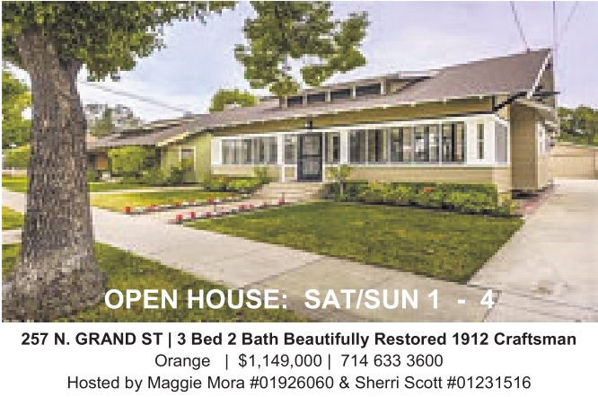 257 N. GRAND ST|3Bed 2Bath Beautifully Restored 1912 Craftsman Orange | $1,149,000 | 714 633 3600 Hosted by Maggie Mora #01926060 &Sherri Scott #01231516