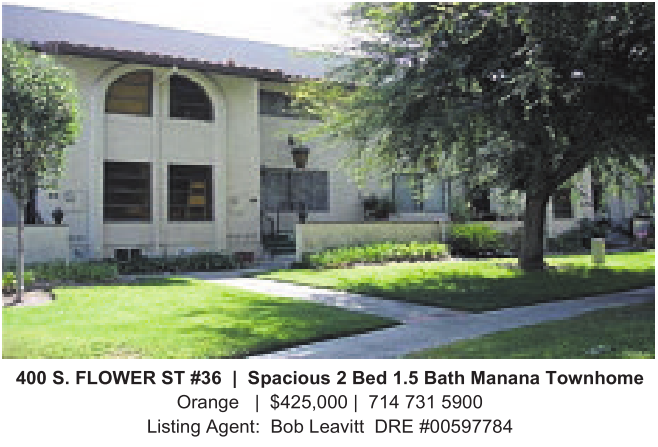 400 S. FLOWER ST#36 | Spacious 2Bed 1.5 Bath Manana Townhome Orange | $425,000 | 714 731 5900 Listing Agent: Bob Leavitt DRE #00597784