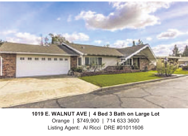 1019 E. WALNUT AVE | 4Bed 3Bath onLarge Lot Orange | $749,900 | 714 633 3600 Listing Agent: AlRicci DRE #01011606