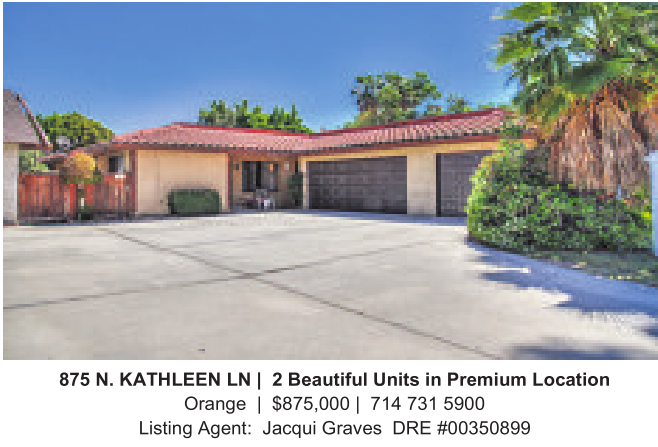 875 N. KATHLEEN LN | 2 Beautiful Units in Premium Location Orange | $875,000 | 714 731 5900 Listing Agent: Jacqui Graves DRE #00350899
