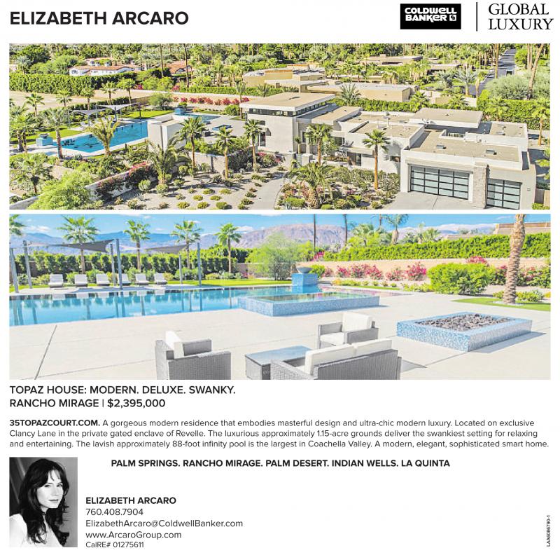 ELIZABETH ARCARO TOPAZ HOUSE: MODERN. DELUXE. SWANKY. RANCHO MIRAGE | $2,395,000 35TOPAZCOURT.COM. A gorgeous modern residence that embodies masterful design and ultra-chic modern luxury. Located on exclusive Clancy Lane in the private gated enclave of Revelle. The luxurious approximately 1.15-acre grounds deliver the swankiest setting for relaxing and entertaining. The lavish approximately 88-foot infinity pool is the largest in Coachella Valley. A modern, elegant, sophisticated smart home. PALM SPRINGS. RANCHO MIRAGE. PALM DESERT. INDIAN WELLS. LA QUINTA ELIZABETH ARCARO 760.408.7904 ElizabethArcaro@ColdwellBanker.com www.ArcaroGroup.com CalRE# 01275611 See also