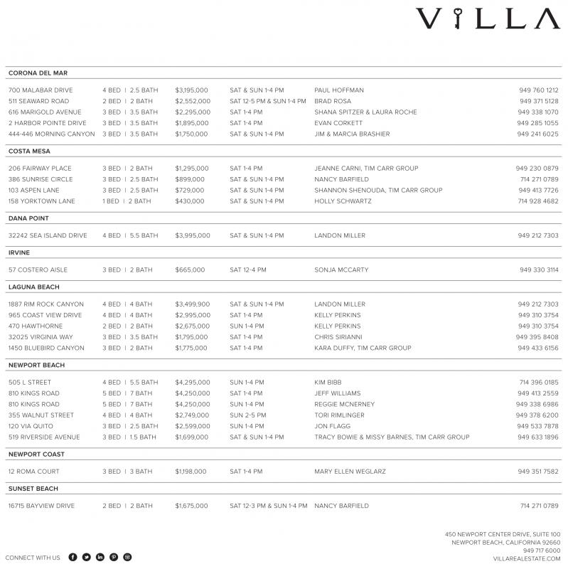 505 L STREET 4 BED | 5.5 BATH $4,295,000 SUN 1-4 PM KIM BIBB 714 396 0185 810 KINGS ROAD 5 BED | 7 BATH $4,250,000 SAT 1-4 PM JEFF WILLIAMS 949 413 2559 810 KINGS ROAD 5 BED | 7 BATH $4,250,000 SUN 1-4 PM REGGIE MCNERNEY 949 338 6986 355 WALNUT STREET 4 BED | 4 BATH $2,749,000 SUN 2-5 PM TORI RIMLINGER 949 378 6200 120 VIA QUITO 3 BED | 2.5 BATH $2,599,000 SUN 1-4 PM JON FLAGG 949 533 7878 519 RIVERSIDE AVENUE 3 BED | 1.5 BATH $1,699,000 SAT & SUN 1-4 PM TRACY BOWIE & MISSY BARNES, TIM CARR GROUP 949 633 1896