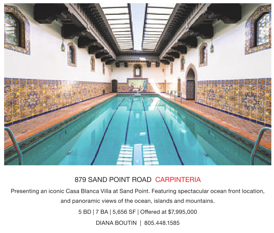 879 SAND POINT ROAD CARPINTERIA Presenting an iconic Casa Blanca Villa atSand Point. Featuring spectacular ocean front location, and panoramic views ofthe ocean, islands and mountains. 5BD|7BA |5,656 SF |Offered at $7,995,000 DIANA BOUTIN | 805.448.1585