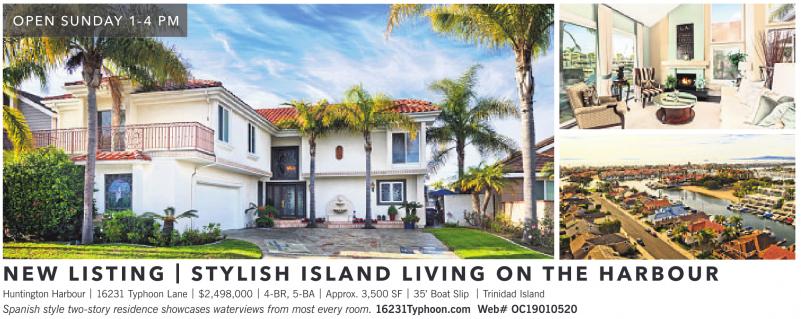 Huntington Harbour | 16231 Typhoon Lane | $2,498,000 | 4-BR, 5-BA | Approx. 3,500 SF | 35’ Boat Slip | Trinidad Island Spanish style two-story residence showcases waterviews from most every room. 16231Typhoon.com Web# OC19010520