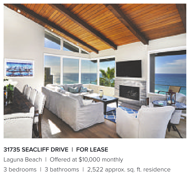 31735 SEACLIFF DRIVE | FOR LEASE Laguna Beach | Offered at $10,000 monthly 3 bedrooms | 3 bathrooms | 2,522 approx. sq. ft. residence