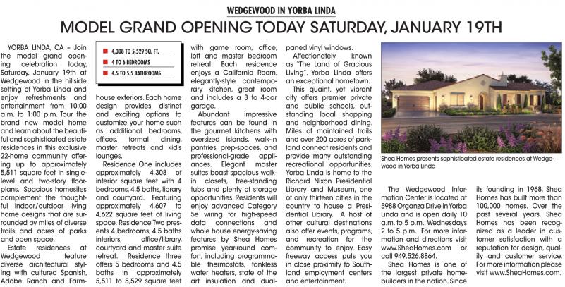 YORBA LINDA, CA – Join the model grand opening celebration today, Saturday, January 19th at Wedgewood in the hillside setting of Yorba Linda and enjoy refreshments and entertainment from 10:00 a.m. to 1:00 p.m. Tour the brand new model home and learnabout the beautiful and sophisticated estate residences in this exclusive 22-home community offering up to approximately 5,511 square feet in singlelevel and two-story floorplans. Spacious homesites complement the thoughtful indoor/outdoor living home designs that are surrounded by miles of diverse trails and acres of parks and open space.