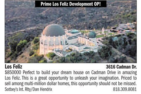 Prime Los Feliz Development OP! Los Feliz 3616 Cadman Dr. $850000 Perfect to build your dream house on Cadman Drive in amazing Los Feliz. This is agreat opportunity tounleash your imagination. Priced to sell among multi-million dollar homes, this opportunity should not be missed. Sotbey’sInt. Rlty/Dan Hendrix 818.309.8081