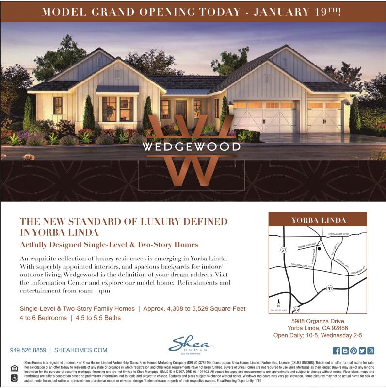 MODEL GRAND OPENING TODAY - JANUARY 19 TH ! THE NEW STANDARD OF LUXURY DEFINED IN YORBA LINDA Artfully Designed Single-Level & Two-Story Homes An exquisite collection of luxury residences is emerging in Yorba Linda. With superbly appointed interiors, and spacious backyards for indoor/ outdoor living,Wedgewood is the definition of your dream address.Visit the Information Center and explore our model home. Refreshments and entertainment from 10am - 1pm 57 YORBA LINDA 91 Single-Level & Two-Story Family Homes | Approx. 4,308 to 5,529 Square Feet 4 to 6 Bedrooms | 4.5 to 5.5 Baths N MAP NOT TOSCALE 55 5988 Organza Drive Yorba Linda, CA 92886 Open Daily; 10-5, Wednesday 2-5 949.526.8859 | SHEAHOMES.COM Shea Homes is aregistered trademark of Shea Homes Limited Partnership. Sales: Shea Homes Marketing Company (DRE#01378646), Construction: Shea Homes Limited Partnership, License [CSLB# 855368]. This isnot an offer for real estate for sale, nor solicitation of an offer to buy to residents of anystate or province in which registration and other legal requirements have not been fulfilled. Buyers of Shea Homes are not required to use Shea Mortgage as their lender.Buyersmay select anylending institution for the purpose of securing mortgage financing and are not limited to Shea Mortgage. NMLS ID #40397, DRE #01197403. All square footages and measurements are approximate and subject to change without notice. Floor plans, maps and renderings areartist’sconception based on preliminaryinformation, not to scale and subject to change. Features and plans subject to change without notice. Windows and doors may varyper elevation. Home pictured may not be actual home for sale or actual model home, but rather arepresentation of asimilar model or elevation design. Trademarksare property of their respective owners. Equal Housing Opportunity.1/19