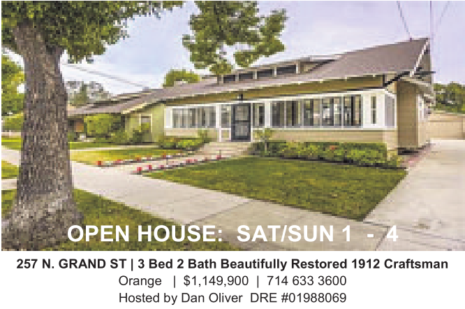 257 N.GRAND ST |3Bed 2Bath Beautifully Restored 1912 Craftsman Orange | $1,149,900 | 714 633 3600 Hosted by Dan Oliver DRE #01988069
