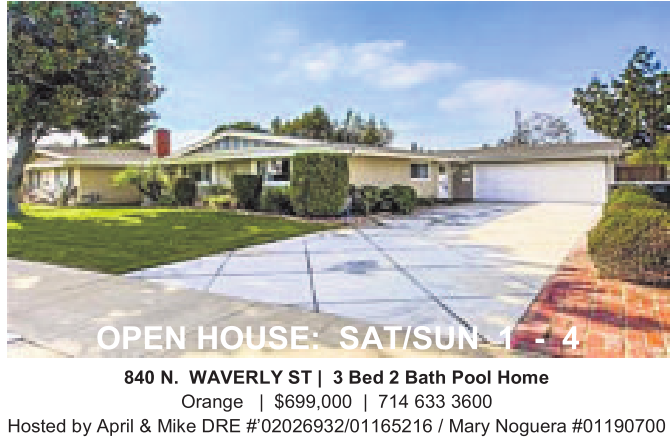 840 N. WAVERLY ST | 3 Bed 2Bath Pool Home Orange | $699,000 | 714 633 3600 Hosted by April &Mike DRE #’02026932/01165216 /Mary Noguera #01190700