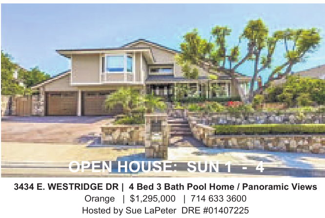 3434 E. WESTRIDGE DR | 4 Bed 3Bath Pool Home /Panoramic Views Orange | $1,295,000 | 714 633 3600 Hosted by Sue LaPeter DRE #01407225