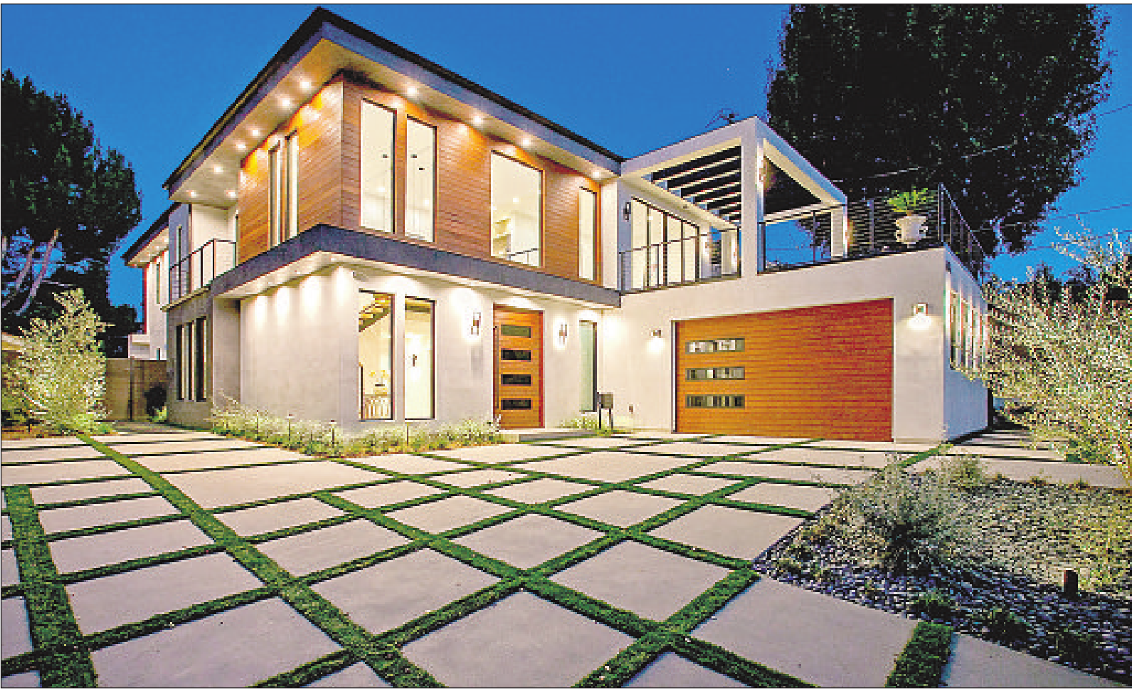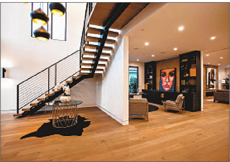 The contemporary-style house, built last year, features a 9-foot pivoting front door, a floating staircase and 24-foot-high ceilings in the common rooms. Pocketing glass doors open from the living room, which has a fireplace and a wine bar, to a covered patio space that overlooks the swimming pool.