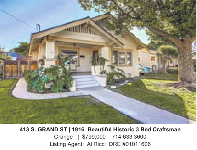 413 S. GRAND ST|1916 Beautiful Historic 3Bed Craftsman Orange | $799,000 | 714 633 3600 Listing Agent: AlRicci DRE #01011606